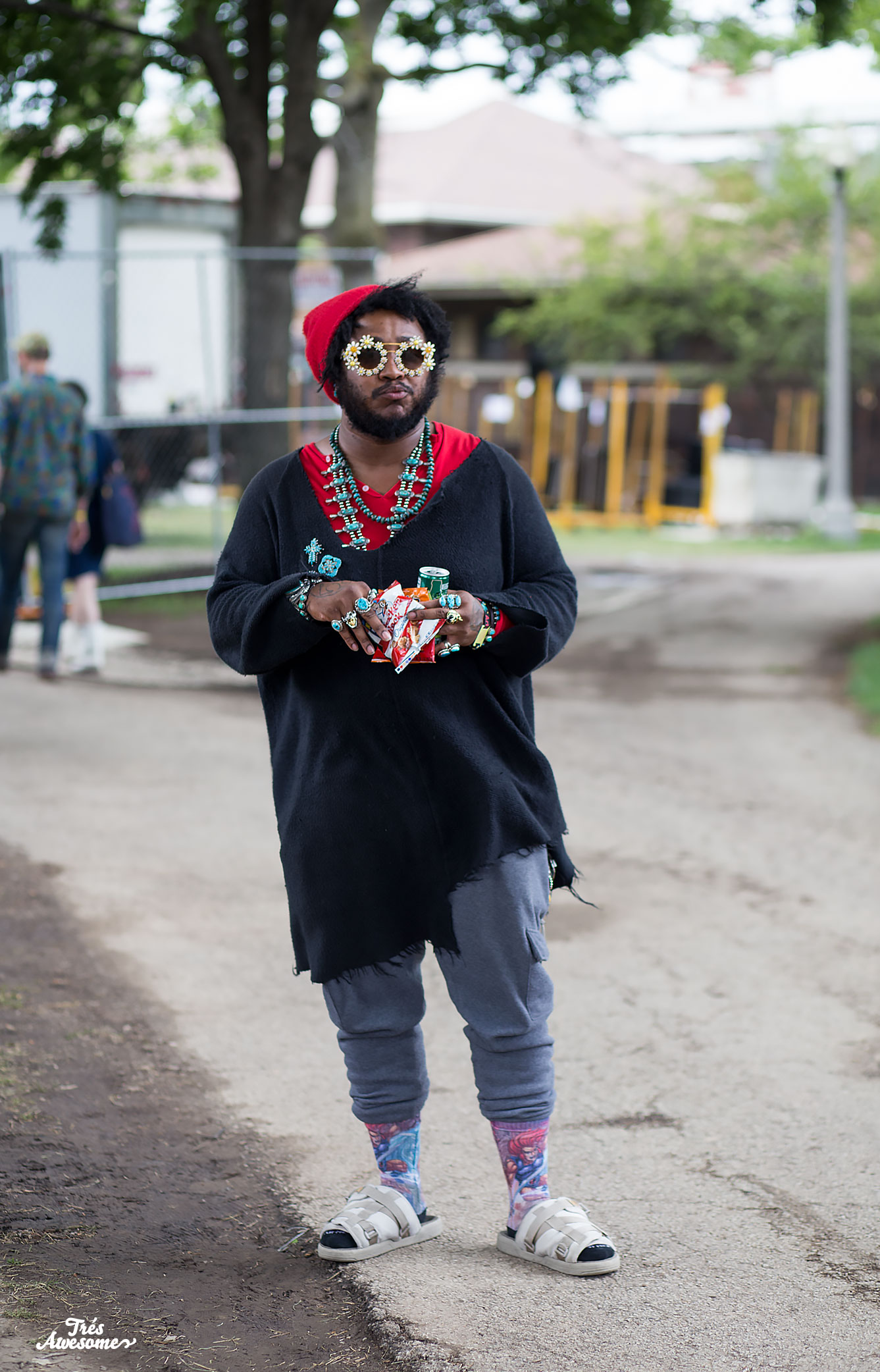Thundercat performed at the Pitchfork Music Festival on Sunday and we caught up with him backstage looking FLY in these Dolce and Gabbana daisy chain sunglasses, Misanthrope shirt and mega-turquoise jewelry.
